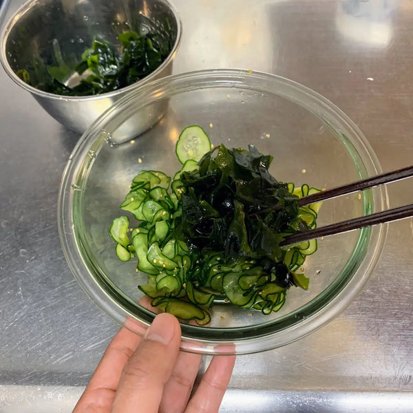 6) Adding the Wakame to the Sunomono