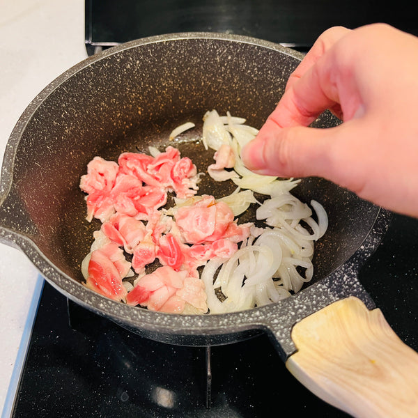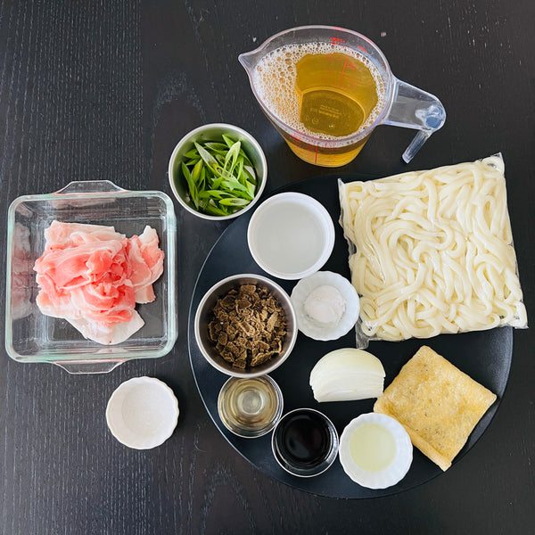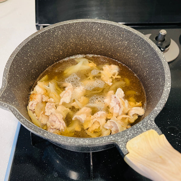 Beyond these core ingredients, you can add whatever you like. There are no strict rules for additional ingredients. In this recipe, I chose pork, onion, aburaage (deep-fried tofu pouches), and green onion, but you can also use other meats and vegetables, such as chicken, beef, carrots, and mushrooms.