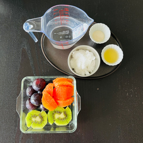 Collect all the ingredients you’ll need: your favorite fruit (peeled and cut), water, sugar (or vegan-friendly sugar if preferred), lemon juice, and kanten (agar) powder.