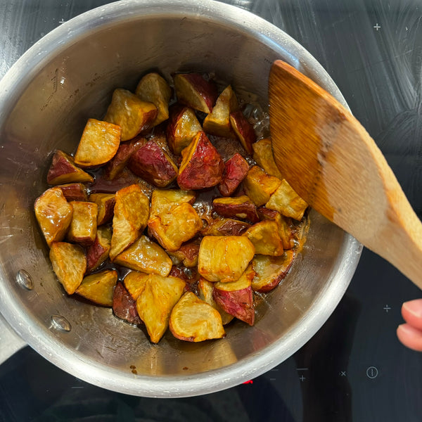 Making candied sweet potatoes is simple. Just cut the sweet potatoes into chunks and fry them until golden brown. Then, prepare the syrup and let it thicken slightly. Toss the fried sweet potatoes in the syrup, coating them evenly for that signature glossy finish.