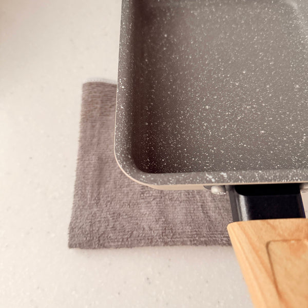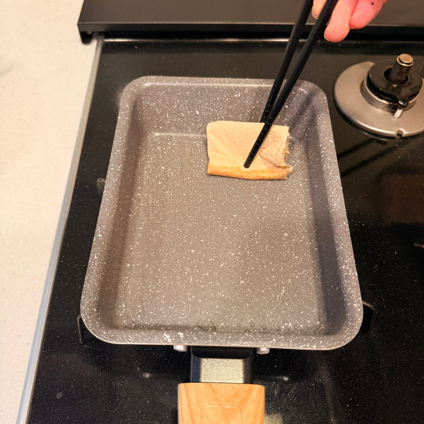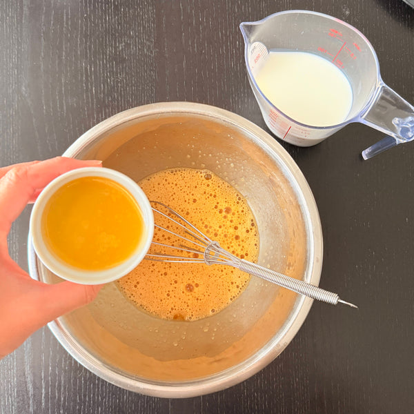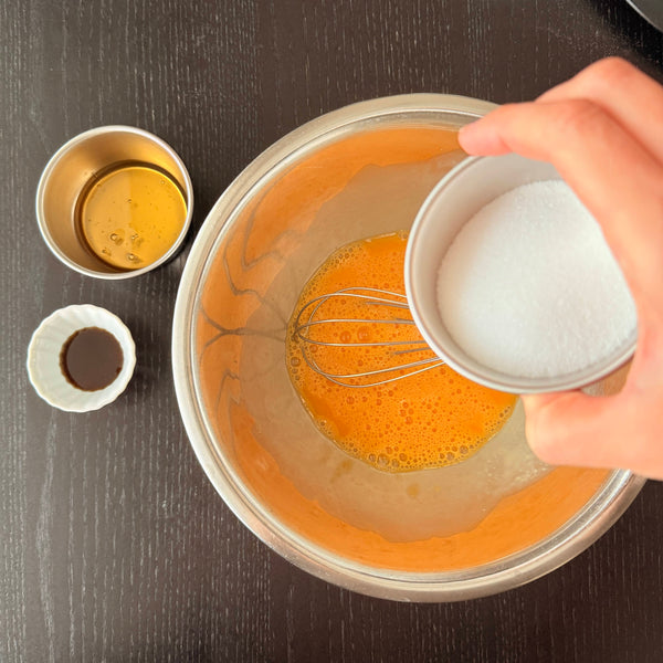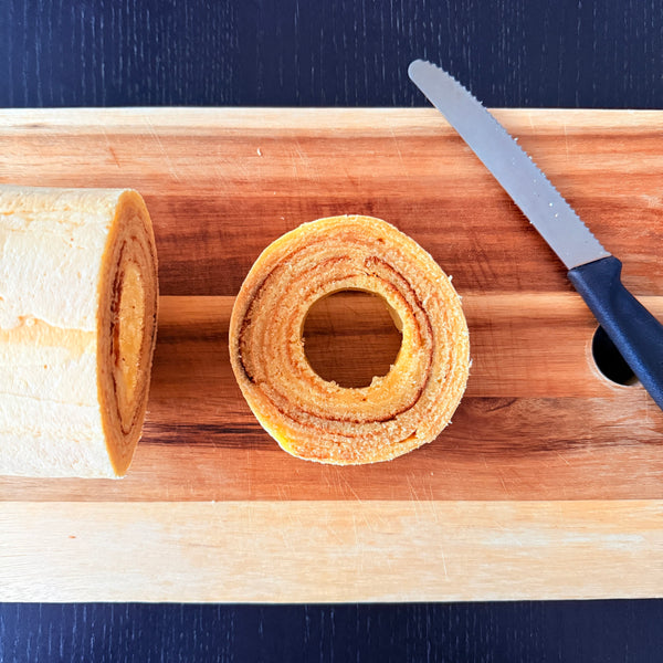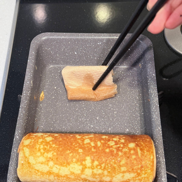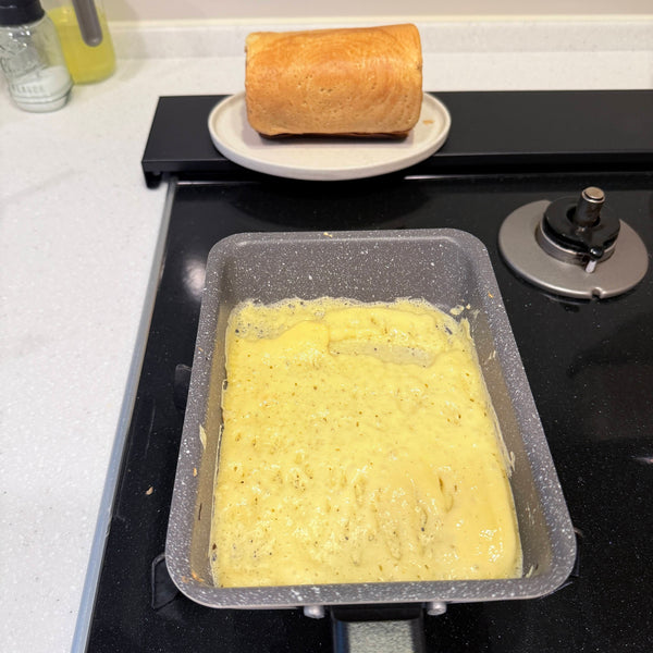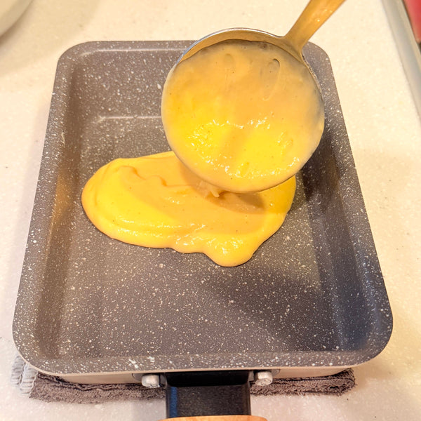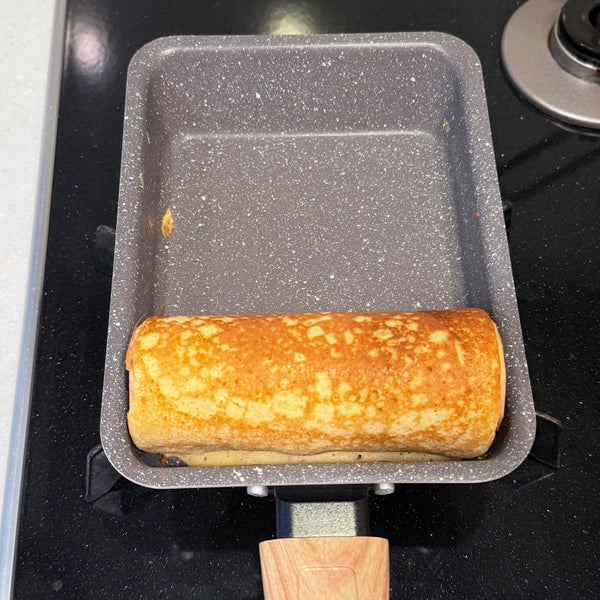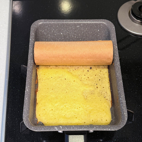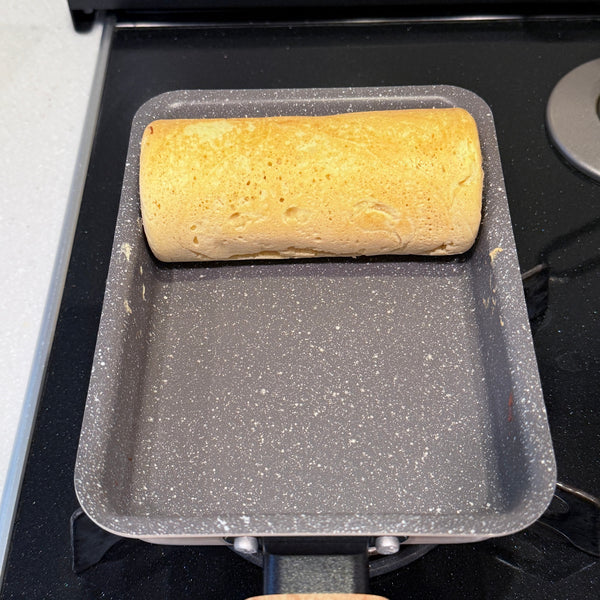 To create thin, even layers, I used a Japanese tamagoyaki pan, but you can use any flat pan. The key is to spread each layer very thinly so the final cake develops clean, beautiful rings. Thicker layers can make the finished roll look uneven.