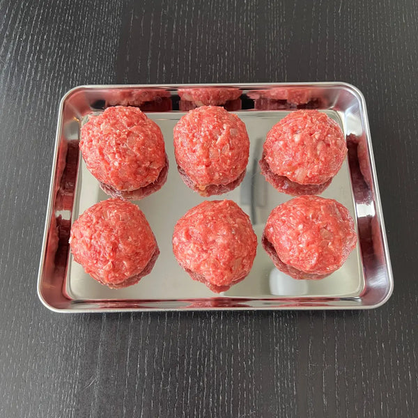 Divide the ground meat mixture into 6 portions and shape each one into a round ball, ensuring to remove any air inside. If the balls are too soft for the next step, place them in the fridge and chill for about 30-40 minutes to make handling easier.
