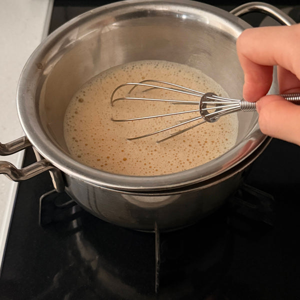 Choosing the right sake is important when making the Japanese version of eggnog. Japanese sake changes its flavor depending on temperature and is categorized into four levels: Atsukan (50 to 55°C), Jyokan (45 to 50°C), Nurukan (40 to 45°C), and Hitohadakan (35 to 40°C). A gentle hot water bath is recommended to control the temperature precisely. In this recipe, stove heating is used, but care must be taken not to overheat the sake, as excessive heat can damage its umami and create harsh alcoholic notes.