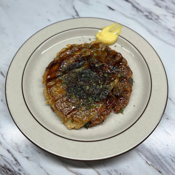 And what's Okonomiyaki without its signature toppings? Homemade vegan okonomiyaki sauce, vegan mayo, and a sprinkle of nori step up to the plate, giving you tangy, sweet, and umami-packed bites in every mouthful.