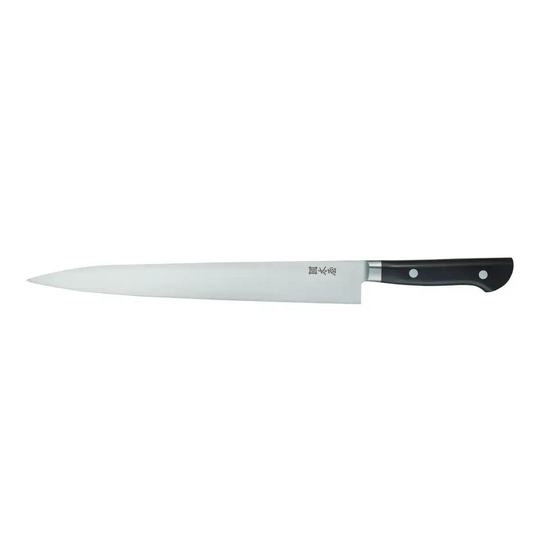 This particular sujihiki is made from Japanese domestic carbon steel, and features a western-style wooden handle for comfort and ease-of-use.